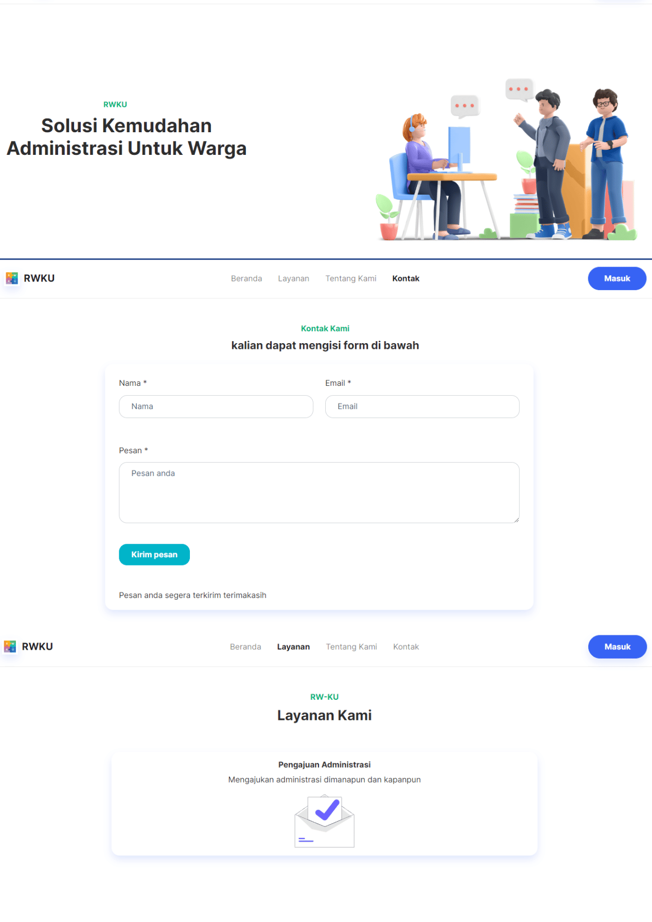 Developing a website with Laravel and MySQL for RW (neighborhood association) administration, encompassing three roles: RW, RT (sub-neighborhood head), and residents. RT can add resident data and process letter requests, residents can create and complete letter documents, while RW is responsible for approving or rejecting letters forwarded by RT. This system facilitates data management and administrative processes at the community level.